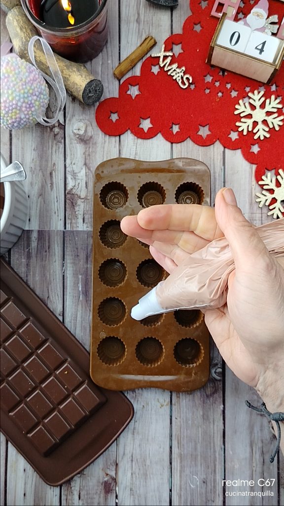 • Aidez-vous d’une poche à douille ou d’une cuillère à café pour répartir le chocolat dans le moule choisi.