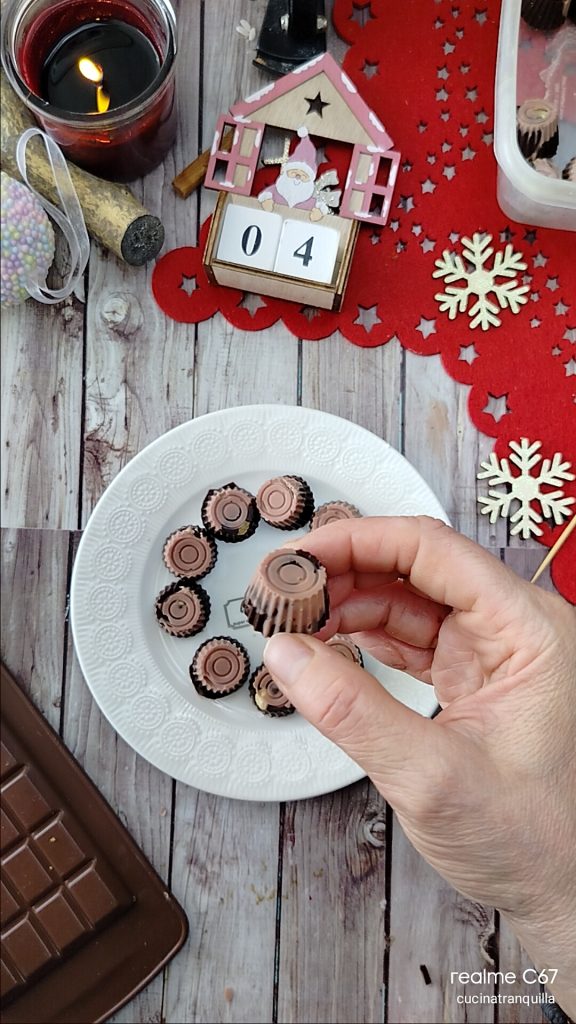 Chocolats de Noël au chocolat Rubis et chocolat noir, avec un cœur de noisettes grillées, trois ingrédients pour une idée cadeau facile et gourmande. Il faut vraiment très peu d’étapes pour les réaliser, surtout si vous avez un micro-ondes, qui est l’outil que j’ai utilisé, mais il est possible de faire fondre le chocolat dans des casseroles différentes et bien propres, je recommande, au bain-marie. Le résultat final sera le même, seulement avec des délais légèrement plus longs. Faire fondre le chocolat au micro-ondes nécessite également de l’attention. En effet, dans les étapes photographiques, je vous conseille de faire fondre le chocolat par étapes. Cela servira à éviter que le chocolat ne brûle à ce stade. En ce qui concerne les moules, si vous n’avez pas beaucoup de familiarité ou de dextérité avec le travail du chocolat, je vous recommande d’utiliser ceux en silicone, plus faciles à gérer lors de la présentation du chocolat. Ci-dessous, je vous laisse quelques idées cadeaux de Noël, tandis qu’après la recette, je réponds aux questions les plus courantes.