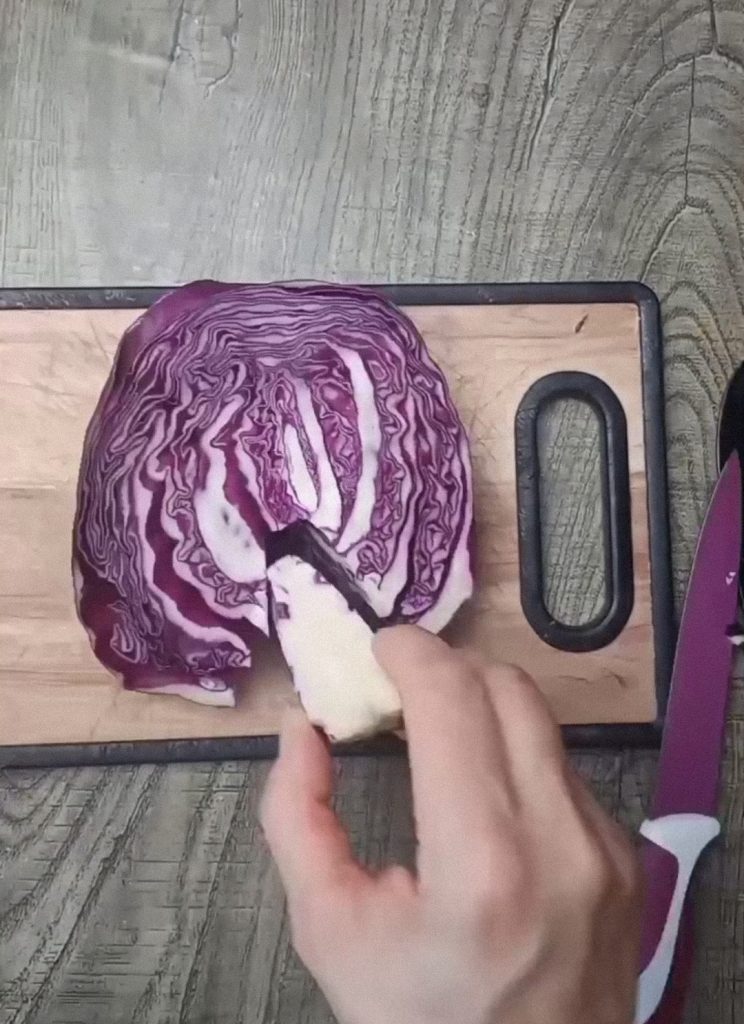 Pour préparer le Chou rouge gratiné au micro-ondes, coupez le chou en deux et retirez la partie du trognon en l’incisant.