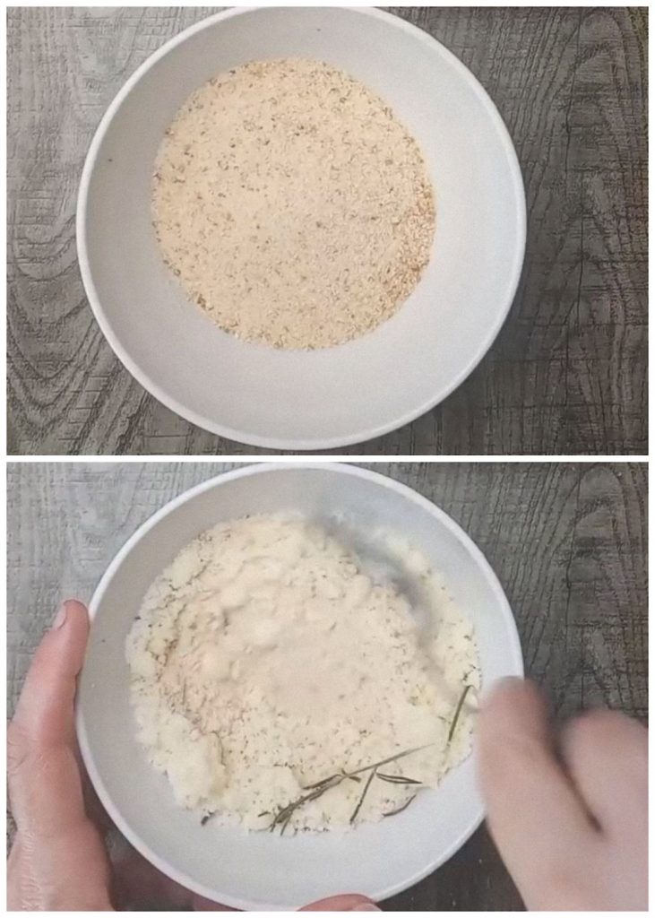 Entre-temps, dans un bol, travaillez la chapelure avec le fromage râpé, le sel, le romarin (toujours facultatif).