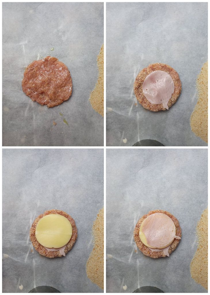 • Garnissons les cordons bleus en alternant sur la base un disque de jambon cuit, un de fromage et un autre de jambon cuit.