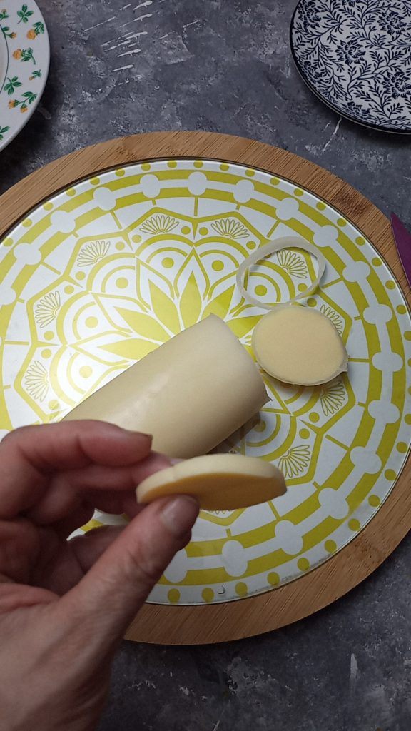 • Avec l’aide d’un emporte-pièce un peu plus grand que celui utilisé pour le jambon, formez la base du cordon bleu.