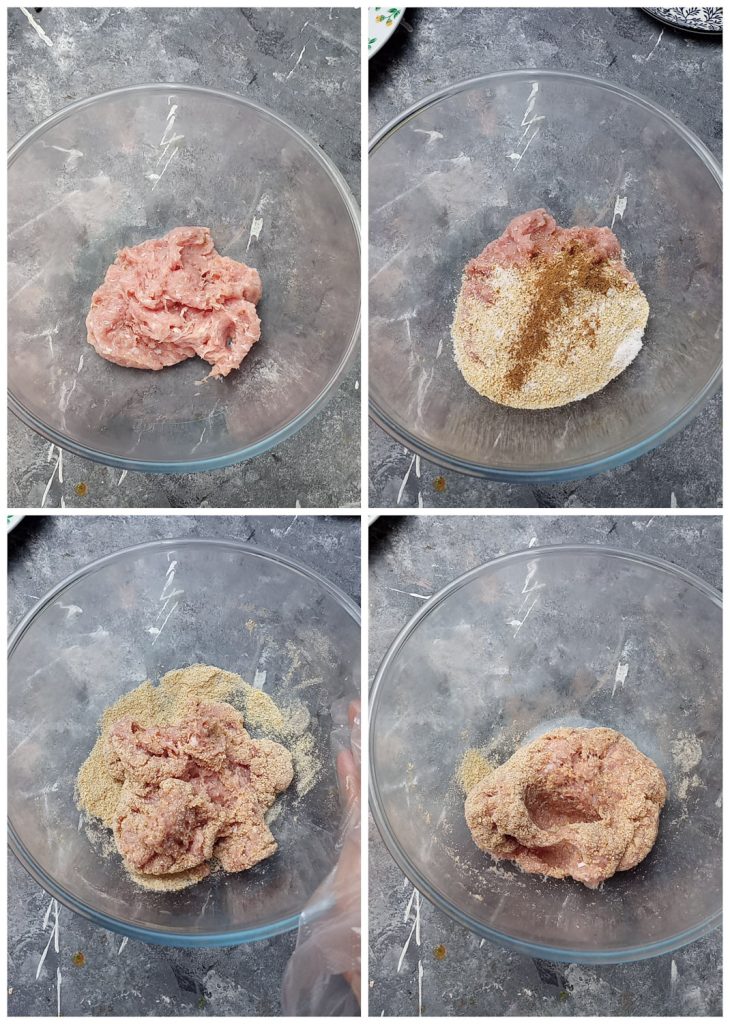 • Pour réaliser les cordons bleus de poulet sans œufs dans la pâte, pour commencer, mélangeons dans un bol la viande hachée de poulet avec la chapelure, le sel fin et la muscade en poudre.