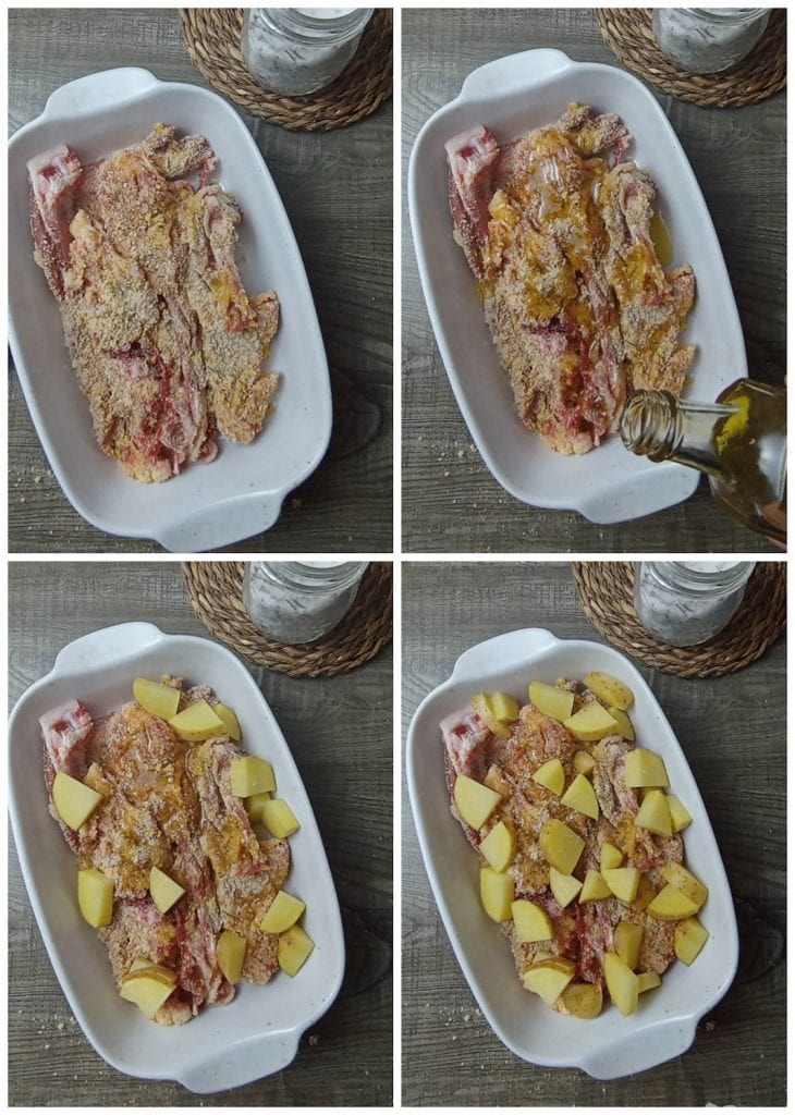 J’ai utilisé, pour 4 personnes, 4 côtelettes d’agneau assez épaisses, enrichissant ensuite la viande d’un accompagnement de pommes de terre, le tout cuisiné ensemble.