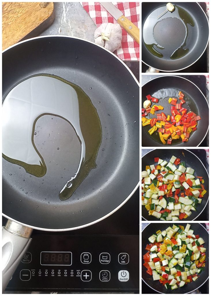 Ajoutez d’abord les poivrons et faites-les ramollir pendant 2 minutes.