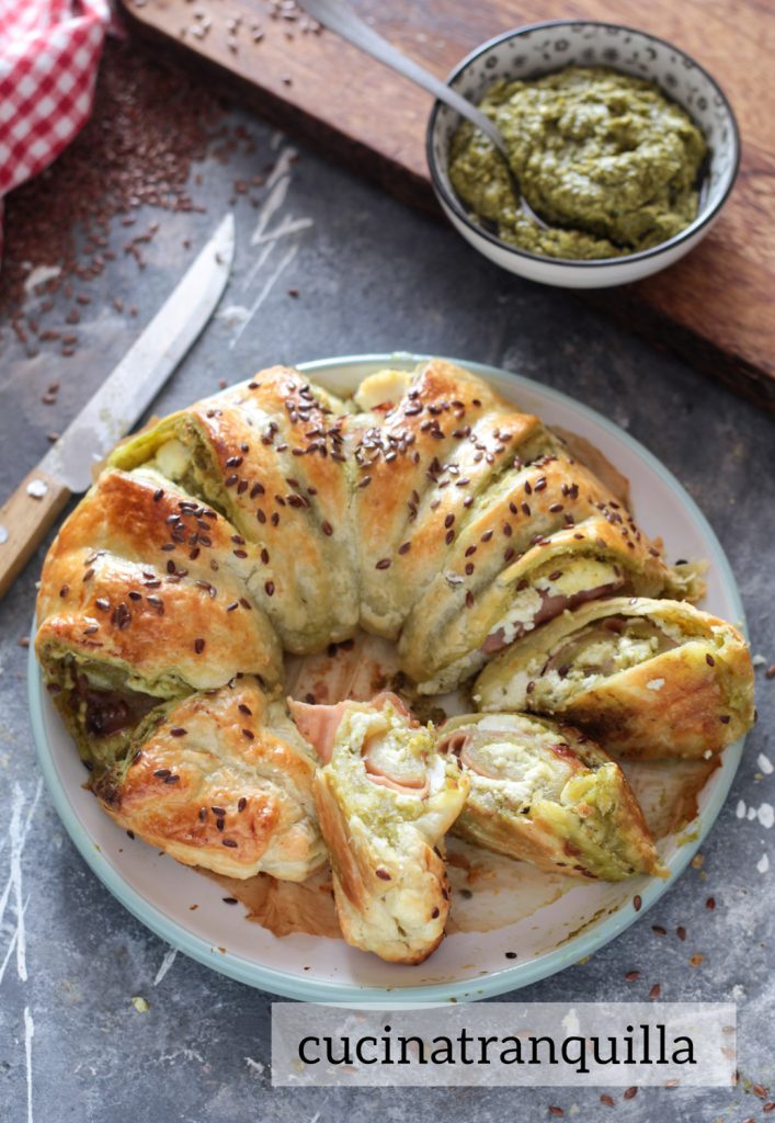 Couronne feuilletée au pesto avec ricotta et mortadelle, une recette facile et savoureuse, très particulière.