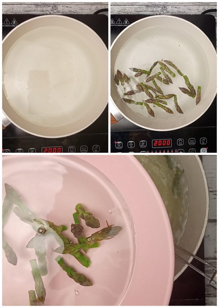Égouttez-les avec une écumoire en les versant dans un bol d’eau froide et, dans la même eau, faites cuire les courgettes et les tiges d’asperges pendant environ 10 minutes.