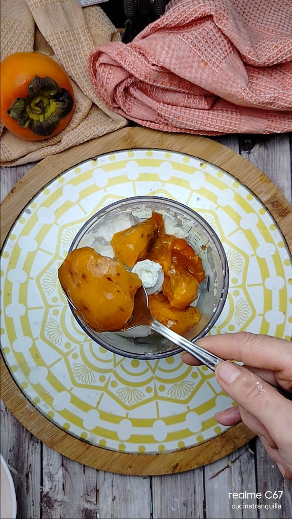 • Pour faire la Crème de ricotta et kakis glacée au chocolat noir, commencez par bien nettoyer les kakis choisis en enlevant la peau, les éventuels noyaux et filaments, et le pédoncule.