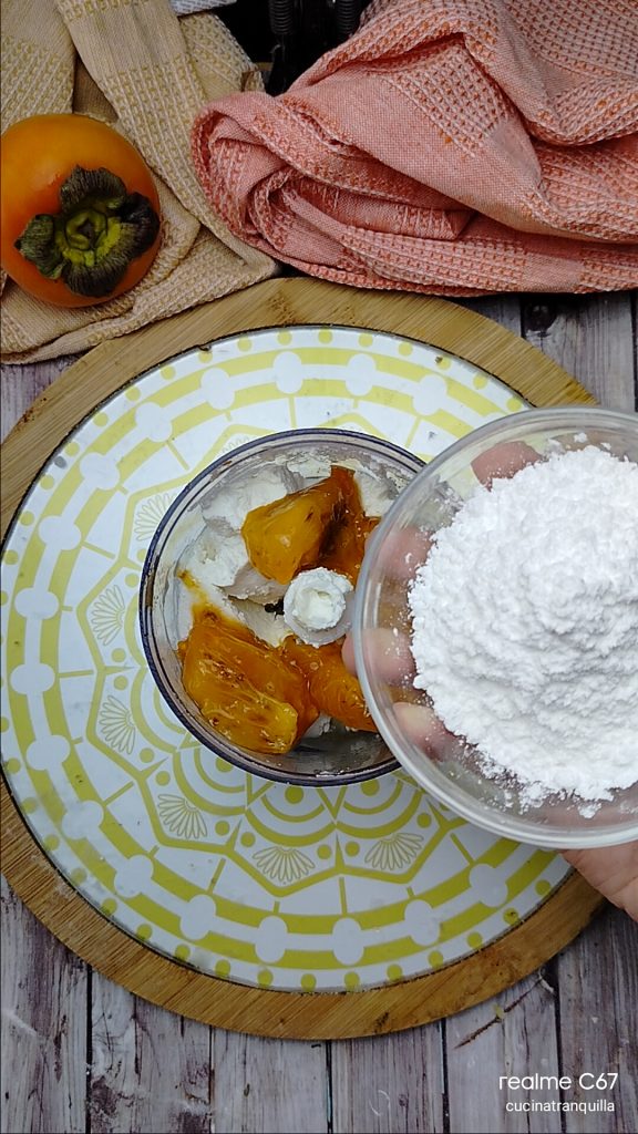 Dans cette recette, il est essentiel d’utiliser un ingrédient assez mou et crémeux. Le kaki pomme, étant plus ferme, n’est pas particulièrement adapté à cette idée. Ci-dessous, je vous montre sa crémeux après repos.