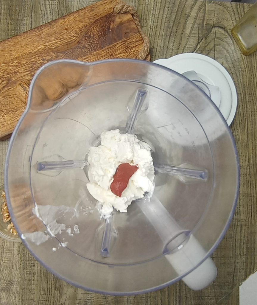 Dans le mixeur, ajoute à la ricotta égouttée, le concentré de tomate.