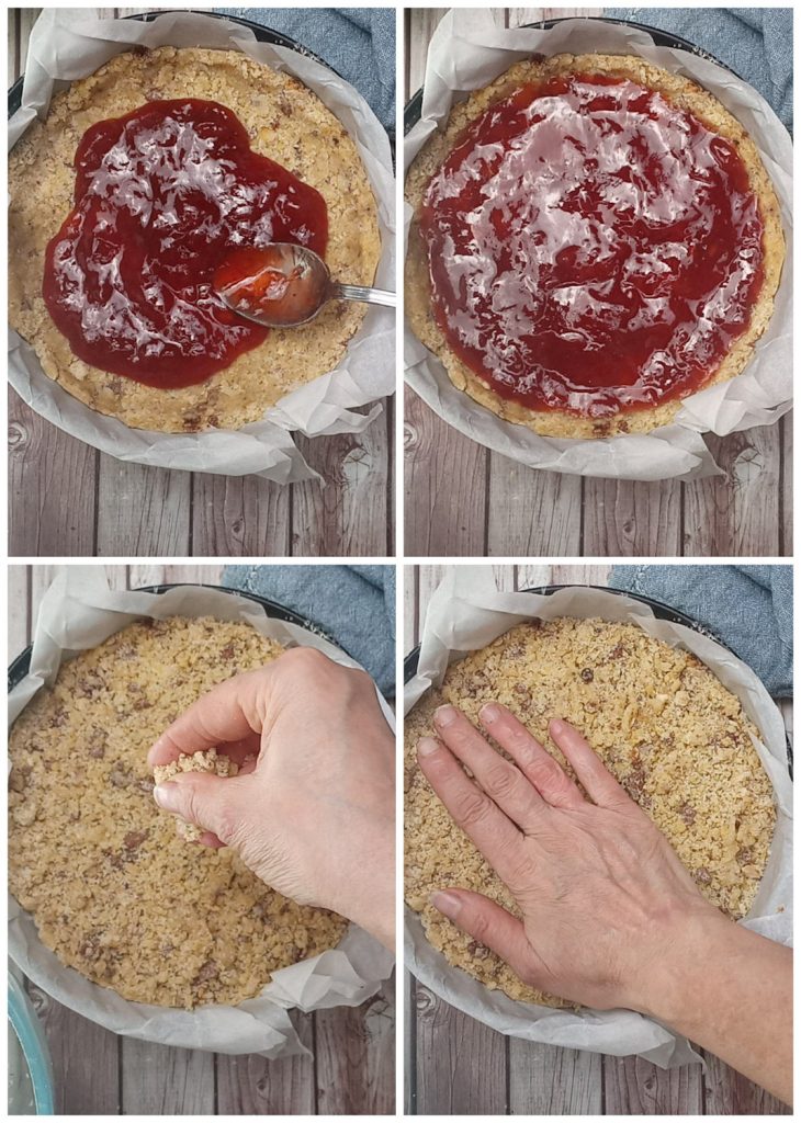 • Étalez la confiture sur la base du crumble, en fermant bien tous les espaces, nivelez-la et couvrez avec le reste de la pâte.