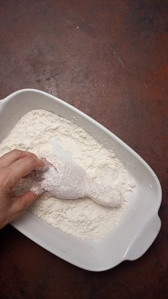 • En attendant, passez les cuisses de poulet dans la farine, en les enrobant de tous les côtés.