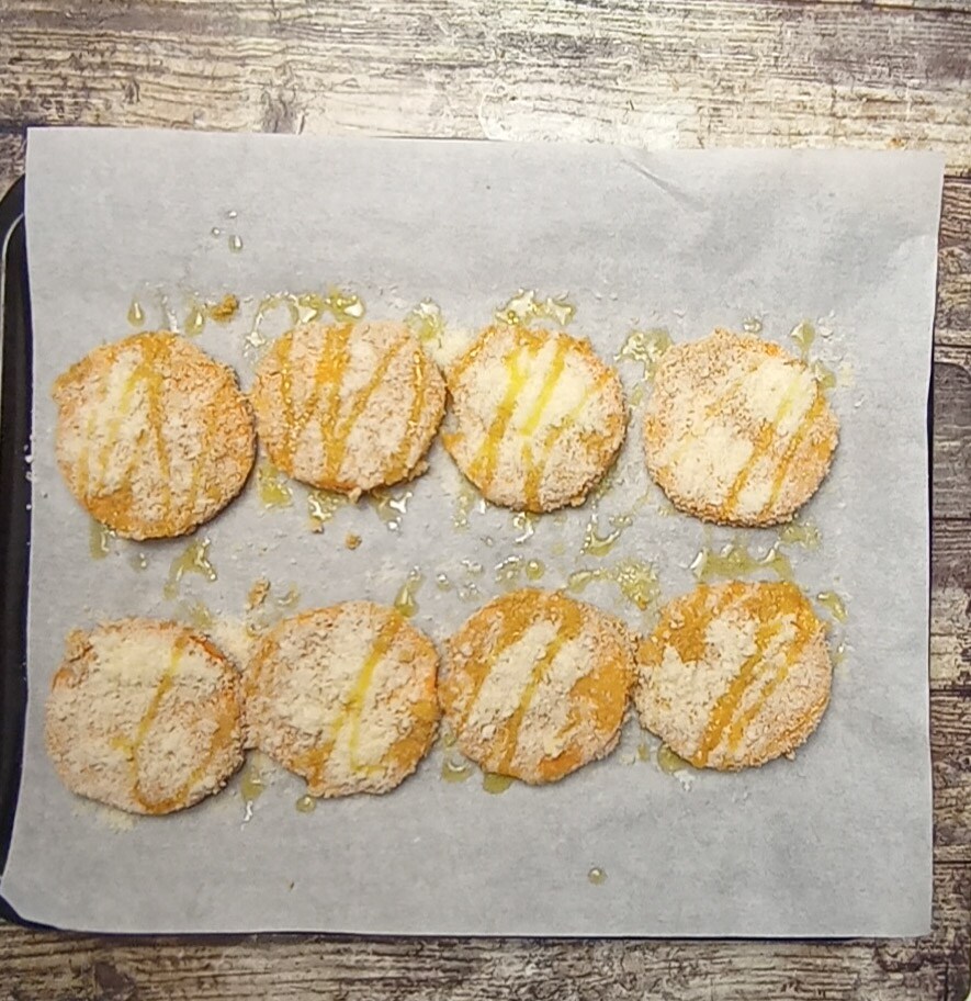 • Répétez l’opération pour toutes les tranches de potiron et disposez-les sur une plaque avec du papier sulfurisé.