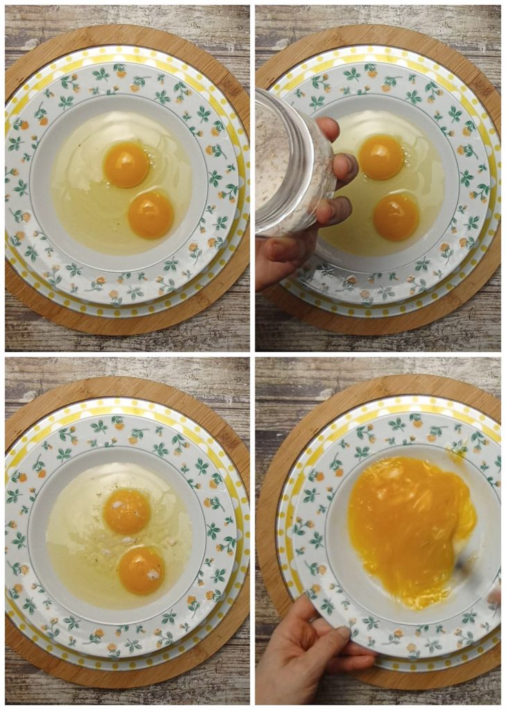 • Dans une assiette, travaillez les œufs avec une demi-cuillère à café rase de sel fin aromatisé aux champignons, en les battant avec une fourchette.