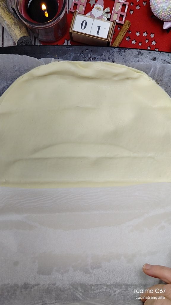 Couvrez la base garnie avec le deuxième rouleau de pâte feuilletée en le faisant bien adhérer et en le superposant sur tous les bords.