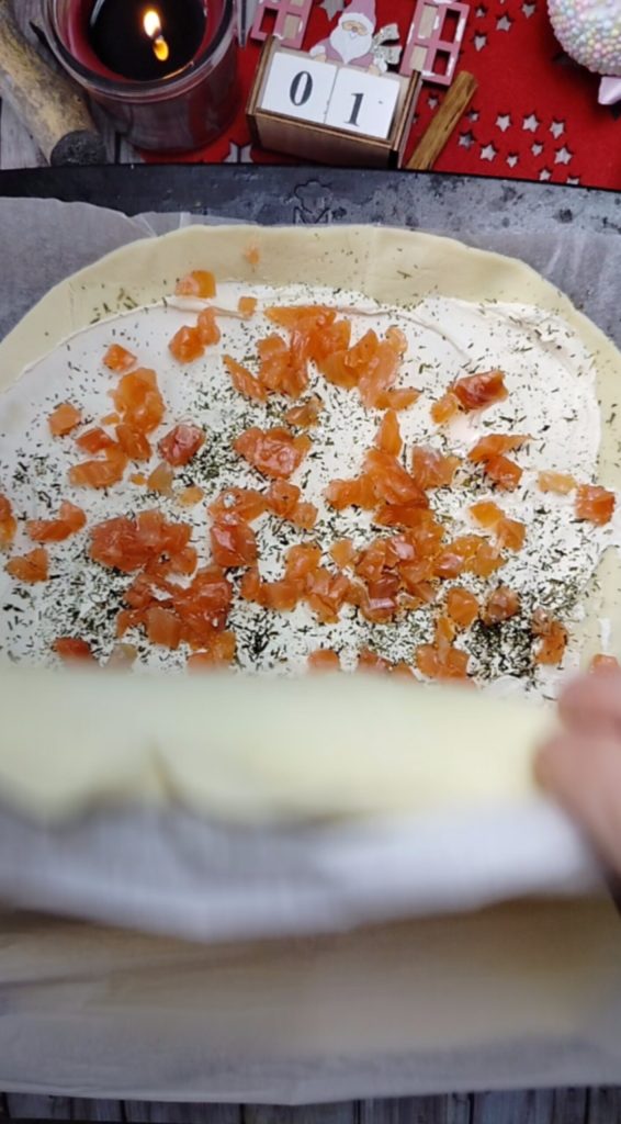 Pour cette recette, j’ai choisi d’utiliser le saumon déjà coupé en dés. Peu importe si vous trouvez celui en tranches, l’important est de le couper pour ensuite garnir la base de pâte feuilletée, en le mettant un peu partout.