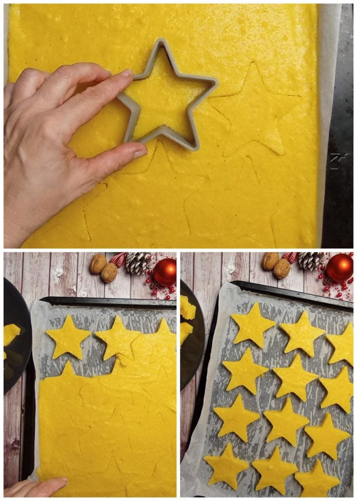 Et maintenant, découpez les petites étoiles dans la polenta refroidie, en utilisant un petit emporte-pièce en forme d’étoile (mais ici aussi, vous pouvez choisir les formes que vous préférez, l’important est qu’elles n’aient pas d’angles trop fins).