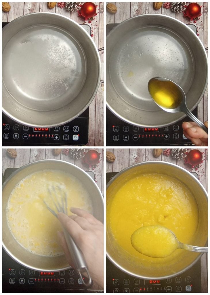 Faites bouillir l’eau, ajoutez une cuillère d’huile d’olive extra vierge et versez la farine en pluie, en mélangeant, pour éviter la formation de grumeaux.