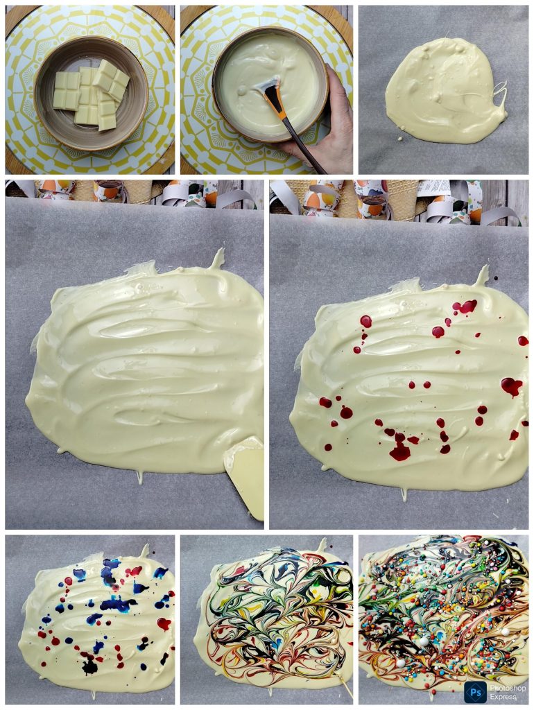Feuilleté de chocolat blanc coloré idée pour Carnaval