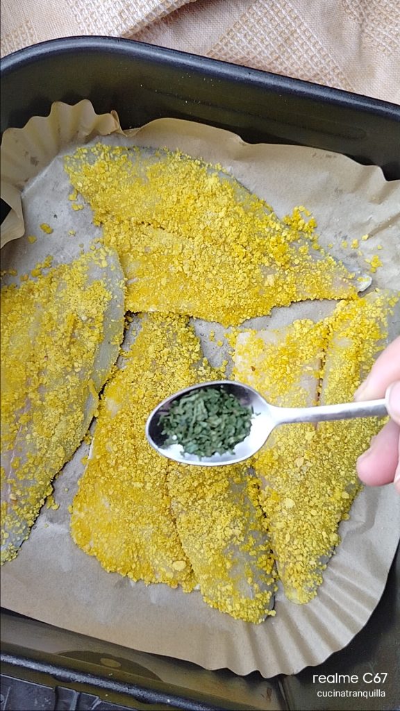 Disposez les filets dans le panier de la friteuse à air recouvert de papier sulfurisé et commencez à répartir l’assaisonnement en commençant par le sel.