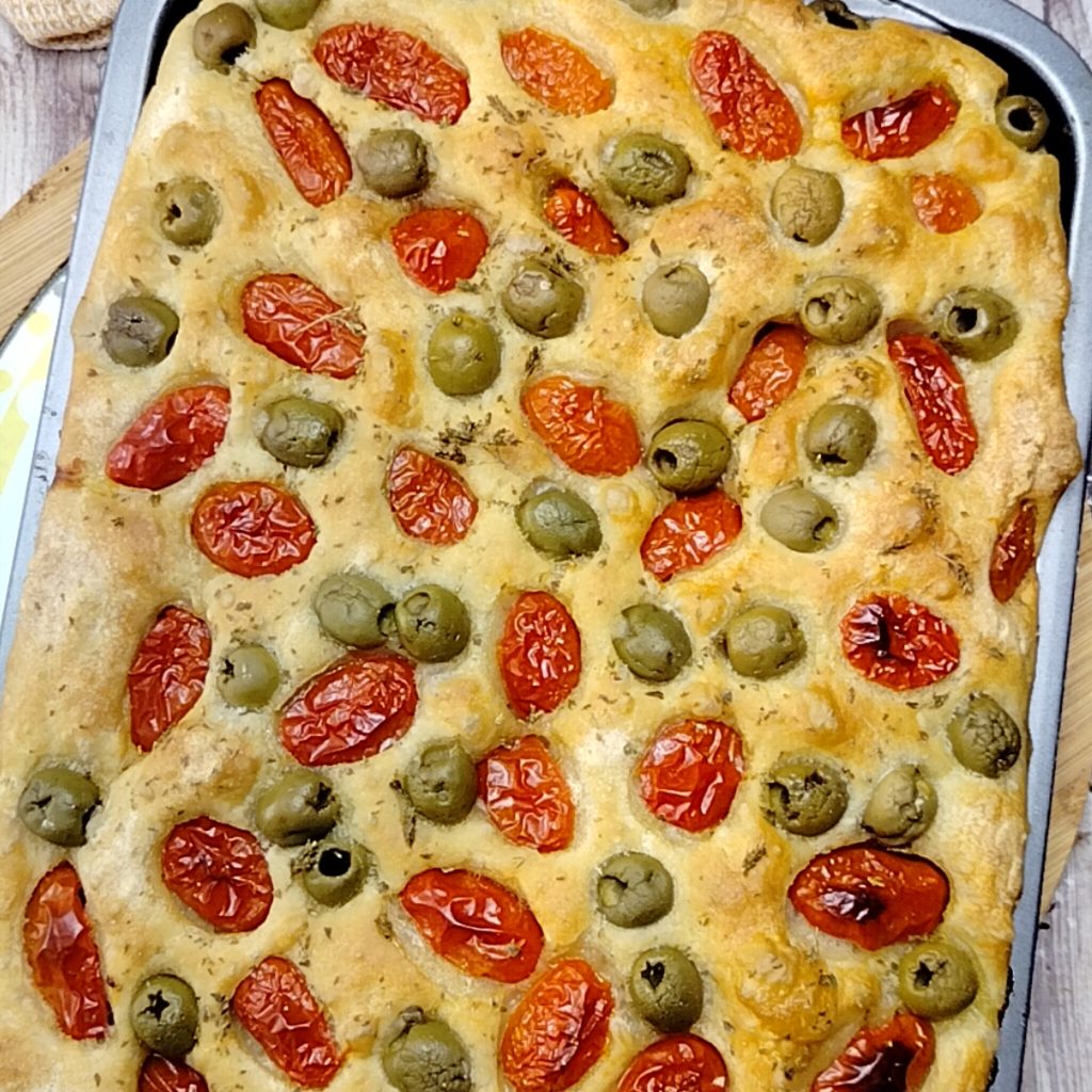Focaccia aux tomates cerises et olives à haute hydratation, une recette délicieuse et très simple, idéale à préparer comme apéritif. Dans cette recette, nous utiliserons la levure de bière classique fraîche, car c’est une idée qui nécessite quelques heures de levée. Le résultat final sera d’une douceur unique pour une pâte alvéolée et riche en saveurs. Cela faisait un moment que je pensais revenir à mes boulangeries. Malheureusement, le temps ne me le permet pas toujours, mais dès que j’arrive à avoir une journée rien que pour moi et ma cuisine, la passion revient. Sur le blog, vous trouverez quelques idées similaires à copier, je vous les laisse ci-dessous, tandis qu’à la fin de la description et des étapes, je réponds aux questions les plus courantes sur ce type de recette.