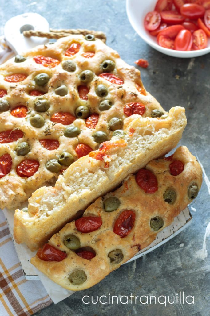 Laissez reposer, toujours couvert, et pendant ce temps, lavez et coupez les tomates cerises et égouttez et séchez les olives dénoyautées. Répartissez-les sur la focaccia, arrosez la surface d’un autre filet d’huile et faites cuire au four à 200°C pendant 30 minutes dans un four préchauffé ventilé.