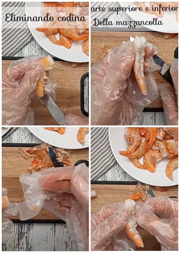 Nous nettoyons également les crevettes, en retirant la petite queue, la carapace et les entrailles, en les incisant délicatement sur le dessus et le dessous, et en les retirant avec précaution.