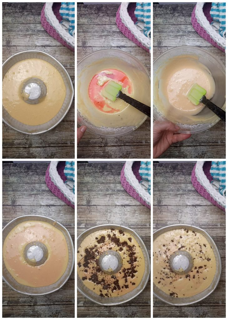 Versez deux tiers de la pâte dans un moule à gâteau légèrement graissé et fariné, nivelez bien. À la partie restante de la pâte, ajoutez l’alchermes, mélangez bien et versez-le dans le moule. Ajoutez les pépites de chocolat, mélangez-les délicatement à la pâte avec une cuillère ou une fourchette.