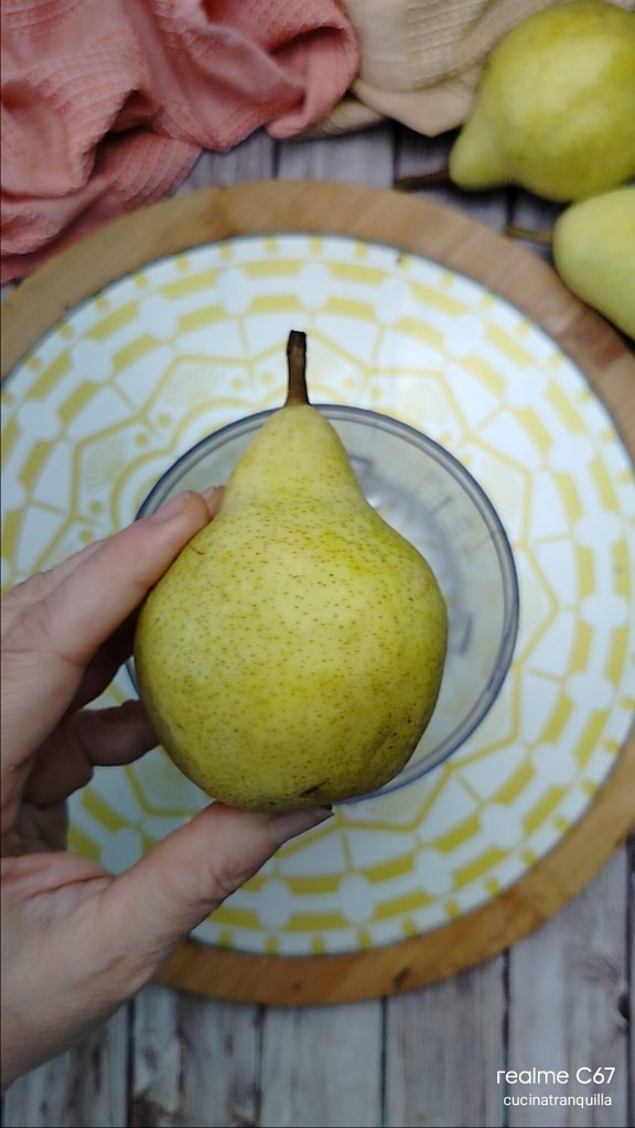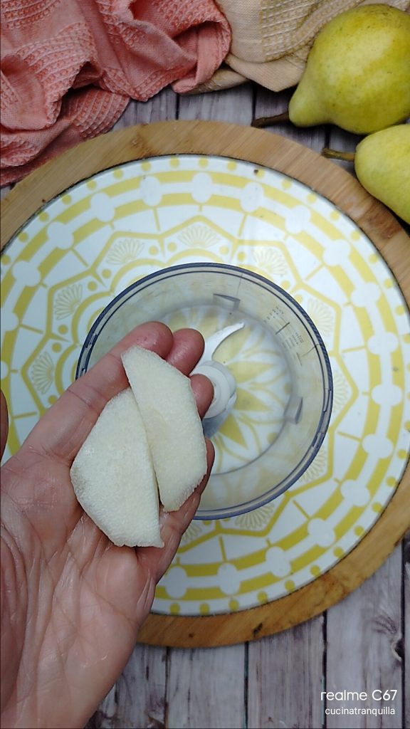 Pour faire le gâteau aux poires mixées et pépites de chocolat sans lactose, procurez-vous d’abord de belles poires Williams juteuses mais pas trop mûres, lavez-les et séchez-les.