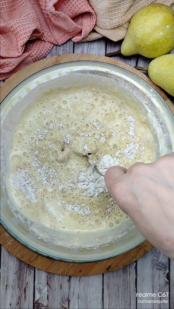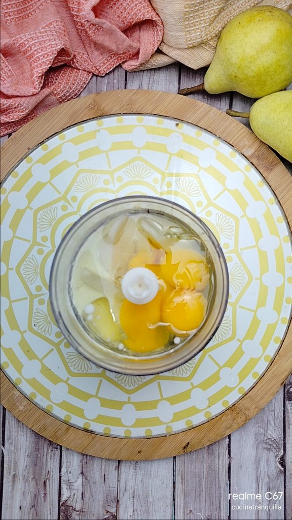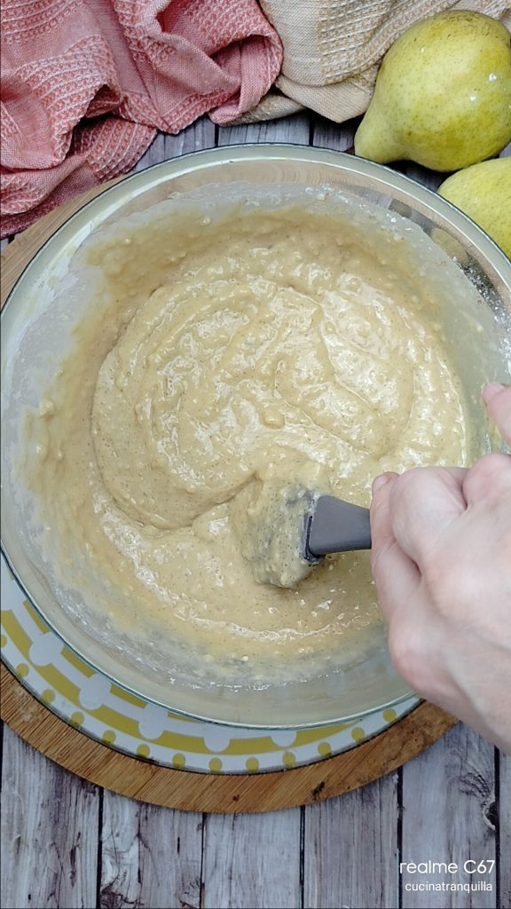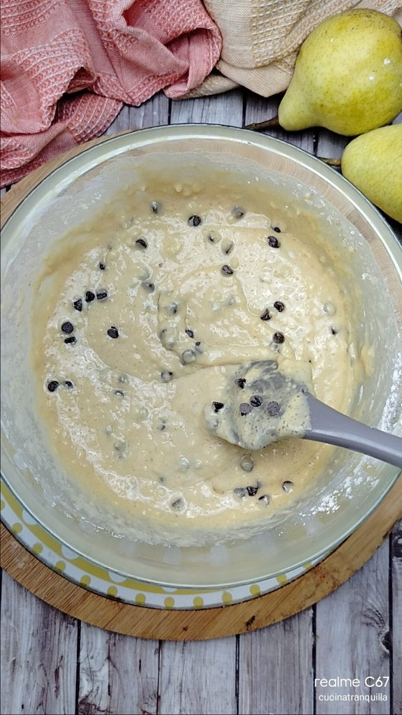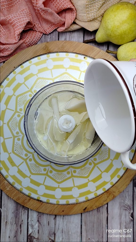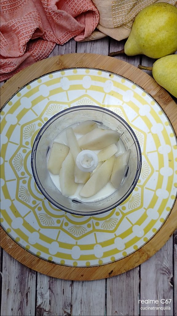 Gâteau aux poires mixées et pépites de chocolat sans lactose, un dessert simple et gourmand, fait avec des poires Williams mixées, une délicieuse gourmandise pour n’importe quel moment de la journée. Si vous avez un mixeur de grande capacité, vous pouvez tout préparer directement dedans, sans besoin de salir d’autres ustensiles. Si, au contraire, comme moi vous en avez un petit, vous pouvez mixer à l’intérieur les poires, bien mûres je vous recommande, avec tous les ingrédients liquides et créer un premier mélange à ajouter ensuite aux poudres. C’est un gâteau très simple et délicieux qui évoque tous les parfums de l’automne. Mon choix d’utiliser les poires Williams comme ingrédient principal de cette délicieuse recette est dû au fait que je les trouve moins farineuses que les autres poires et beaucoup plus tendres et faciles à travailler. Ci-dessous, je vous laisse quelques idées pour utiliser les poires dans vos recettes, tandis qu’à la fin de la recette, je réponds aux questions les plus fréquentes pour cette idée.