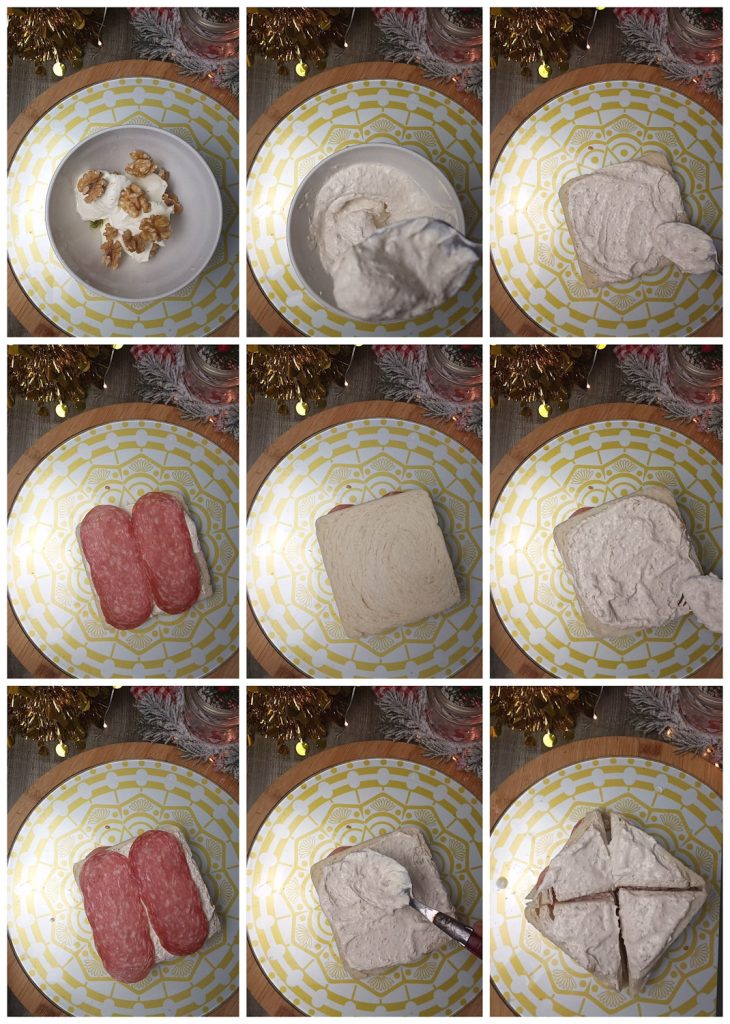 Pour faire les sandwiches blancs, mixez le fromage tartinable avec les noix jusqu’à obtenir une crème plutôt lisse.