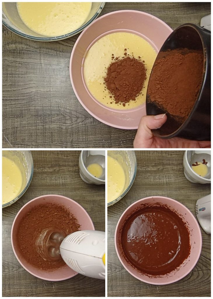 Dans la partie foncée, ajoute les 40 g de cacao et là aussi, mélange bien le tout.