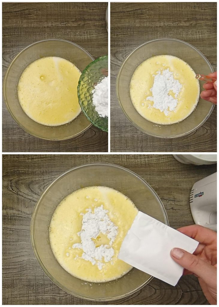 À ce stade, commence à incorporer les poudres. Ajoute la fécule de pomme de terre et l’arôme que tu as choisi.