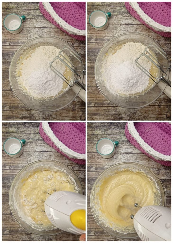 Ajoutez le lait, la farine, la levure, la fécule et continuez à mélanger les ingrédients, jusqu’à obtenir une préparation lisse et homogène.