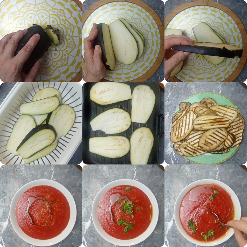 Pour réaliser le gratin d’aubergines grillées, commencez par retirer le pédoncule des aubergines et, après les avoir lavées, coupez-les en tranches d’environ 1 cm d’épaisseur.
