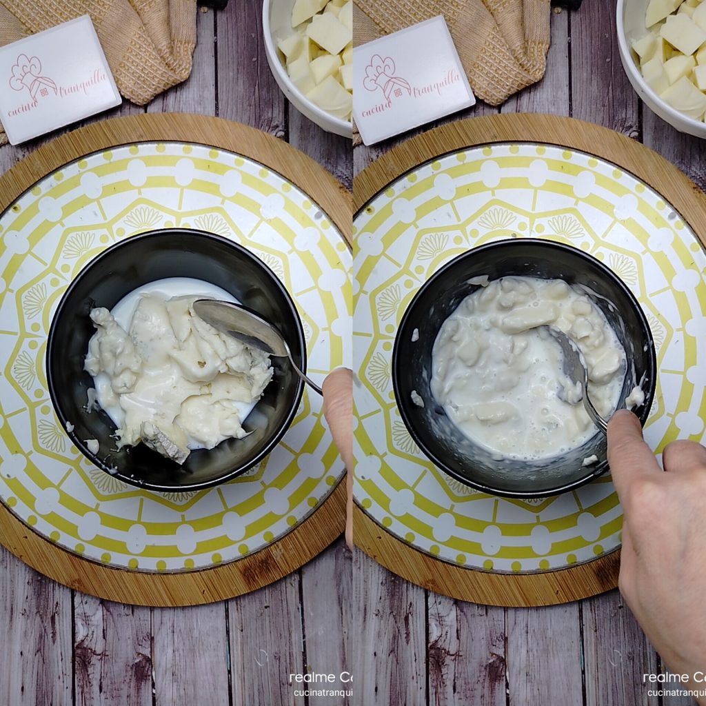 • Chauffez légèrement le lait et, dans un petit bol, utilisez-le pour rendre le gorgonzola crémeux. Travaillez-le avec une cuillère.