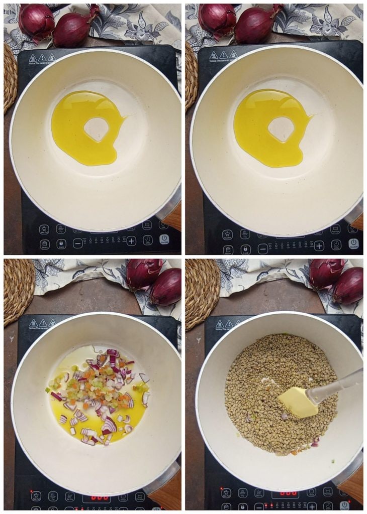 Faites-les revenir dans l’huile pendant une minute et ajoutez les lentilles.