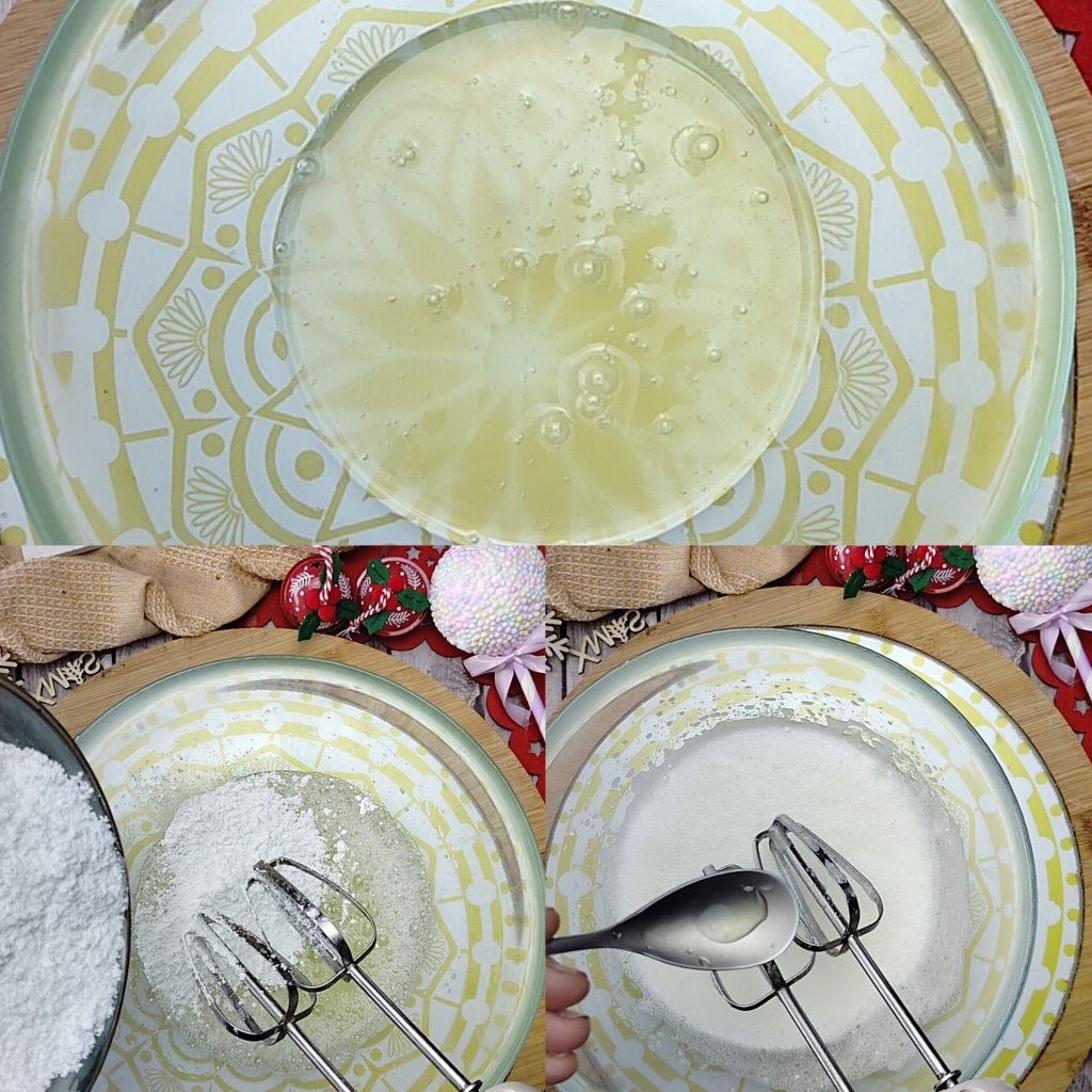 Pour faire les meringues de l’Épiphanie, procurez-vous tout d’abord des blancs d’œufs frais. Je préfère utiliser ceux prêts à l’emploi ou, alternativement, si j’ai besoin des jaunes, j’utilise les blancs d’œufs traditionnels à condition qu’ils soient complètement exempts de jaune, pour éviter des problèmes de montée. Dans un bol très propre, versez les blancs d’œufs. Ajoutez un peu de sucre glace à la fois et commencez à les monter. Ajoutez ensuite les gouttes de jus de citron.