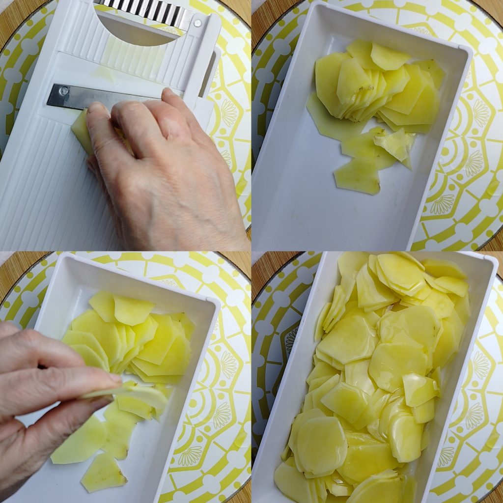 Pour réaliser le millefeuille de pommes de terre et jambon cuit sans précuisson, commencez par couper finement les pommes de terre à l’aide d’une mandoline, après les avoir épluchées et lavées. Faites-les reposer dans une solution d’eau salée pendant environ 30 minutes. Égouttez-les et essuyez-les, puis assaisonnez-les d’un filet d’huile et de sel. Mélangez bien.
