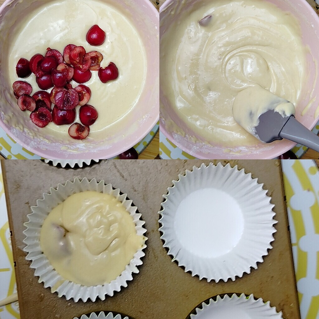 Terminez cette étape en ajoutant les morceaux de cerise et, avec une spatule, incorporez-les aux autres ingrédients.