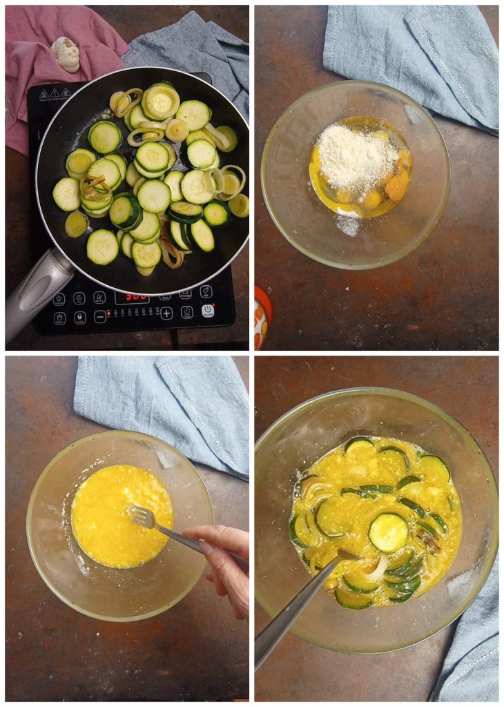• Dans un bol, travaille les œufs avec le fromage râpé, une autre pincée de sel et ajoute le poireau avec les courgettes, en mélangeant délicatement.