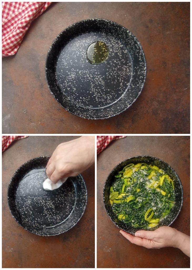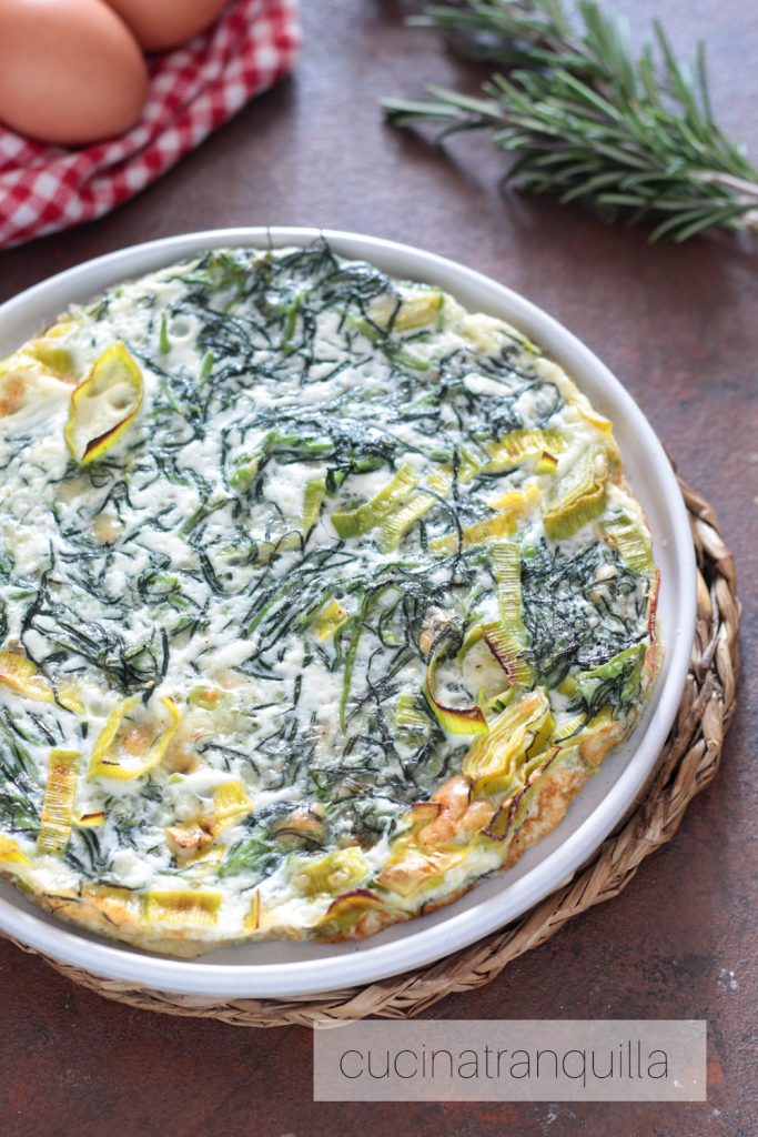 Omelette de blancs d’œufs avec agretti et poireaux, une idée facile et savoureuse pour un plat léger et protéiné en même temps.