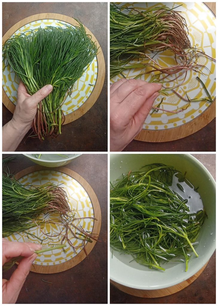 • Pour faire l’Omelette de blancs d’œufs avec agretti, commencez par enlever les racines des agretti avec un couteau.