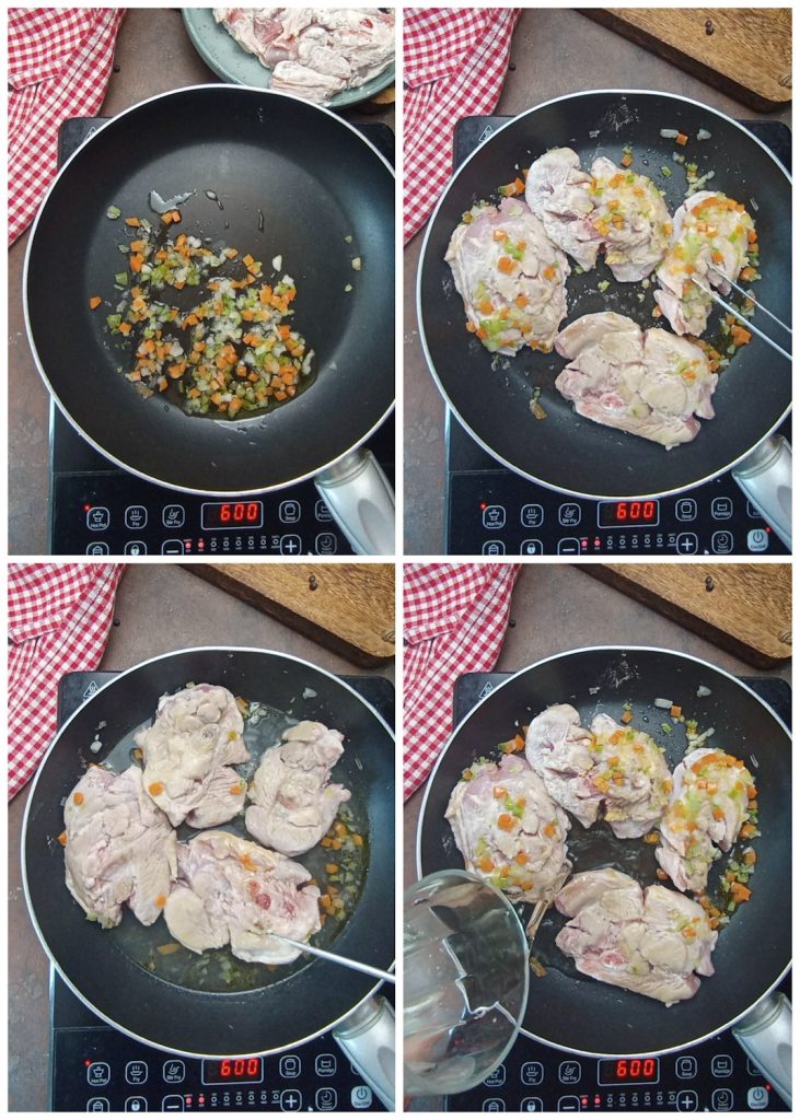 Pour préparer l’Osso buco de dinde à la poêle, tout d’abord, si ce n’est pas déjà fait, coupez les légumes du soffritto en petits dés.
