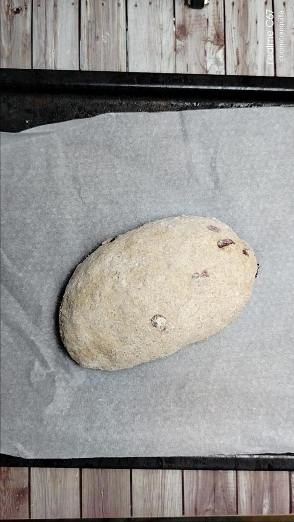Après lui avoir donné une forme allongée, transférez-le sur une plaque de cuisson avec du papier sulfurisé et laissez-le reposer couvert d’un torchon pendant 30 minutes. Passé ce temps, coupez délicatement le pain à la surface avec un couteau aiguisé et enfournez-le dans un four chaud ventilé à 190°C.