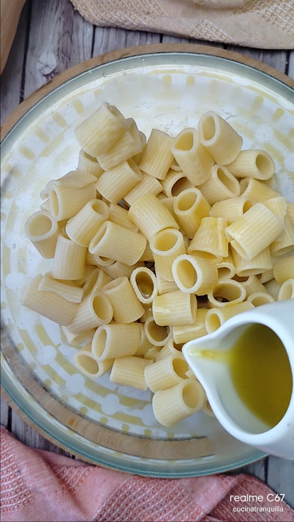 • Faites cuire les pâtes choisies, de préférence courtes, dans une grande quantité d’eau salée. Égouttez-les et laissez-les refroidir dans un bol avec un filet d’huile d’olive extra vierge, en les mélangeant de temps en temps pour éviter qu’elles ne collent.