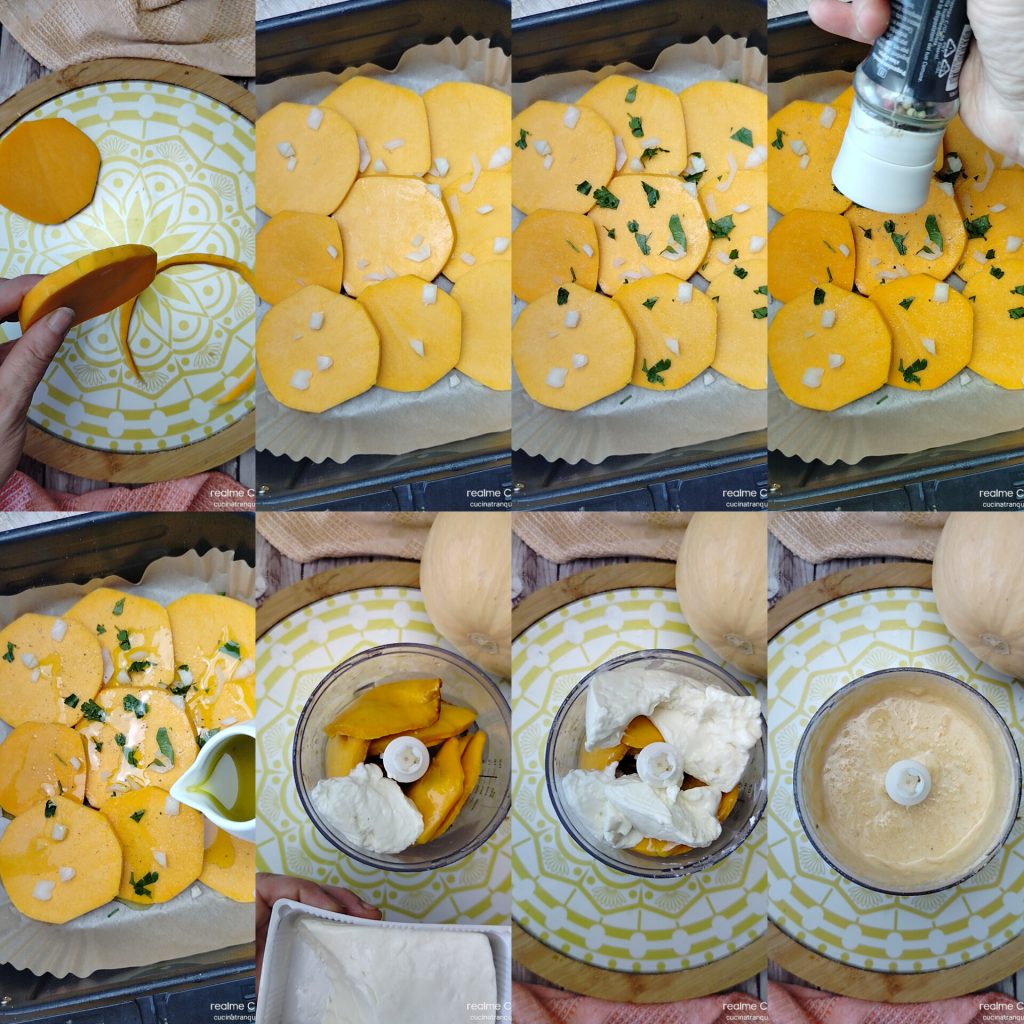 Le potiron doit être tendre, alors vérifiez avec les dents d’une fourchette si c’est vraiment le cas. Sinon, poursuivez la cuisson 2-3 minutes de plus. Laissez-le tiédir quelques minutes avant de le mettre dans le bol du mixeur. Si vous n’en avez pas besoin tout de suite, laissez-le refroidir complètement pour éviter que le stracchino ne s’aigrit. Mixez le tout jusqu’à obtenir une consistance crémeuse et homogène. La crème est prête,