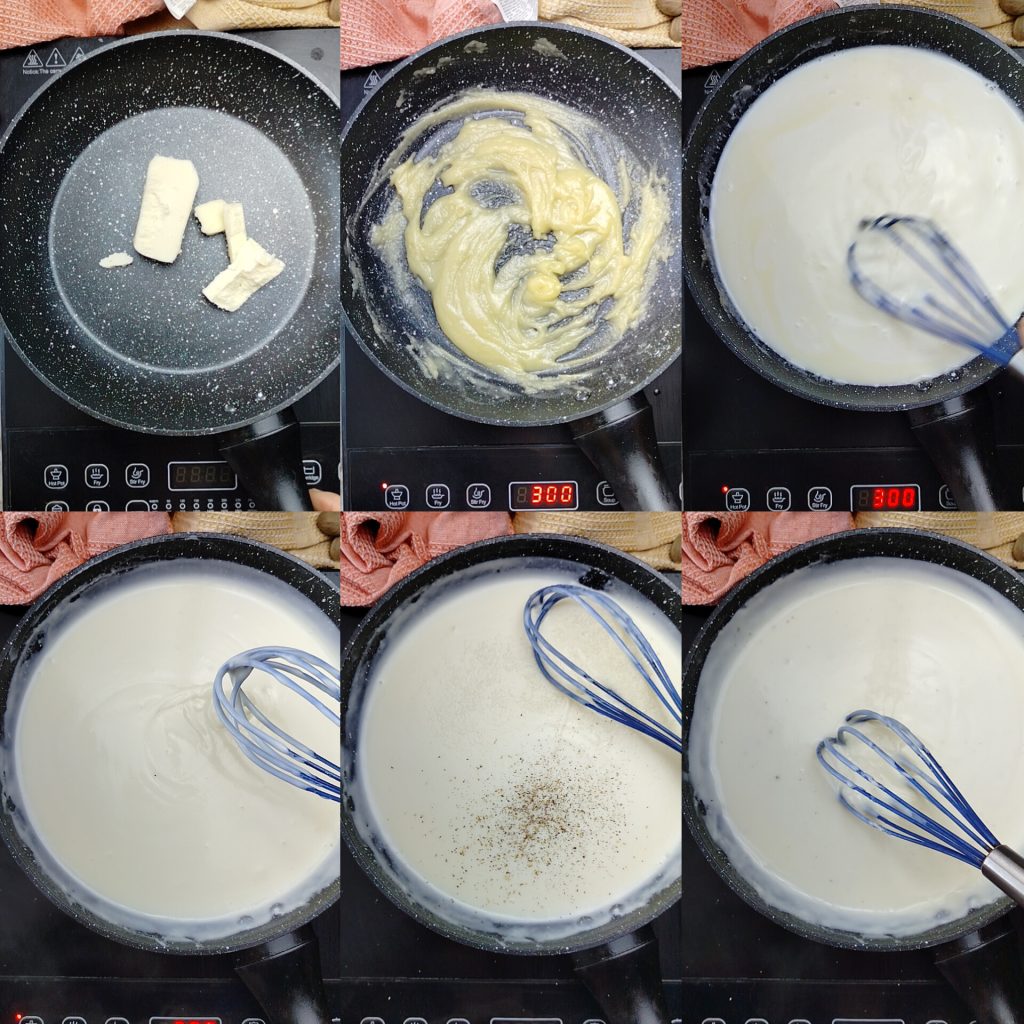 Pour réaliser les Pâtes au four champignons et saucisse avec béchamel sans lactose, préparez la Béchamel sans lactose. Commencez par le roux, c’est-à-dire le mélange qui va servir à lier la béchamel à base de beurre et de farine. Dans une petite casserole assez grande et antiadhésive, faites fondre le beurre. Ajoutez la farine et mélangez très bien à l’aide d’un fouet manuel ou d’une spatule en silicone. Une fois obtenu une base crémeuse, mettez-la de côté dans un bol. Chauffez le lait choisi et ajoutez le roux. Mélangez toujours à feu doux sans vous arrêter. Cela prendra quelques minutes, mais cette étape est fondamentale pour la réussite de la recette. Quand la béchamel est suffisamment épaissie, en levant le fouet, vous pouvez laisser une légère écriture. À ce moment-là, elle sera prête. Éteignez le feu et ajoutez la noix de muscade à votre goût. Ajoutez le sel seulement à la fin de la cuisson. La béchamel est prête. Transférez-la dans un bol et couvrez-la avec du film alimentaire pour éviter la formation d’une pellicule désagréable en surface. Une fois refroidie à température ambiante, conservez-la au réfrigérateur toujours couverte pour un maximum de 48 heures.