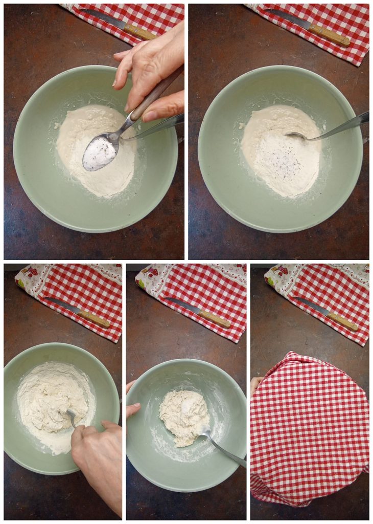 • Ajoutons la farine restante, le sel et continuons à pétrir, toujours avec la cuillère, jusqu’à obtenir un mélange doux mais assez homogène.