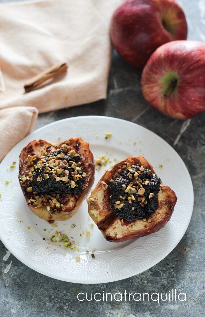 Pour faire les Pommes cuites avec scrucchiata de raisin à la friteuse à air, tout d’abord lave bien les pommes, enlève la tige et la partie du trognon, puis remplis-les avec une bonne cuillère de scrucchiata.